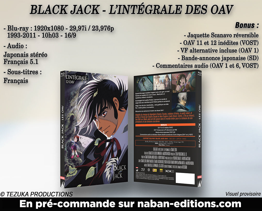 Black Jack, c’est le médecin sans diplôme à qui on demande l’impossible une fois toutes les autres options légales épuisées. Pour la première fois, vous pourrez découvrir ou redécouvrir les OAV en HD avec pour la première fois les OAV 11 et 12 totalement inédites en France !